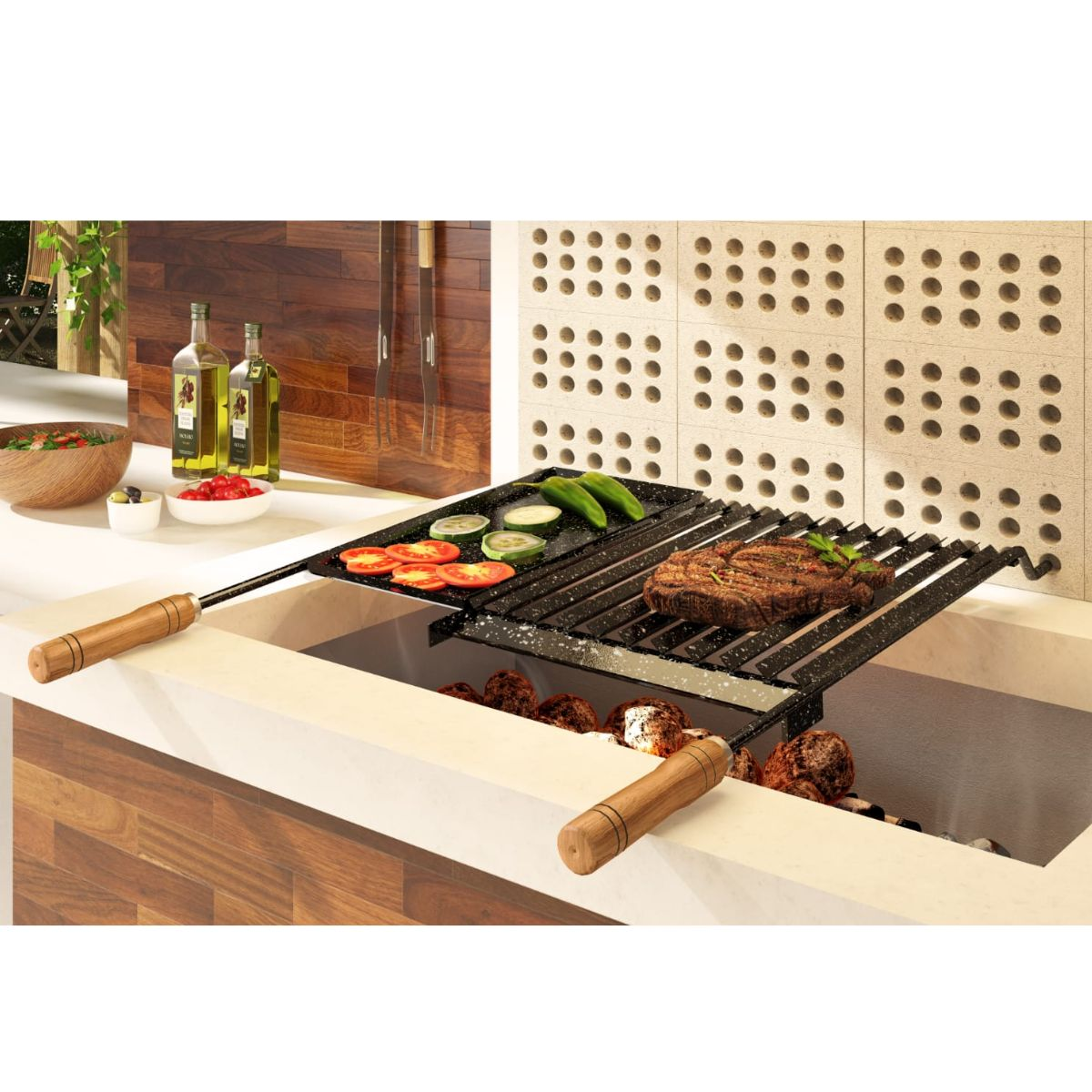 Esse sistema exclusivo permite o preparo de diversos tipos de alimentos ao mesmo tempo, sem que os sabores se misturem, proporcionando uma experiência mais limpa e controlada no churrasco. Seu acabamento esmaltado na cor preta oferece resistência ao calor, fácil limpeza e proteção contra oxidação, enquanto os cabos em madeira de reflorestamento Uva Japão, com acabamento envernizado, garantem segurança e conforto no manuseio.