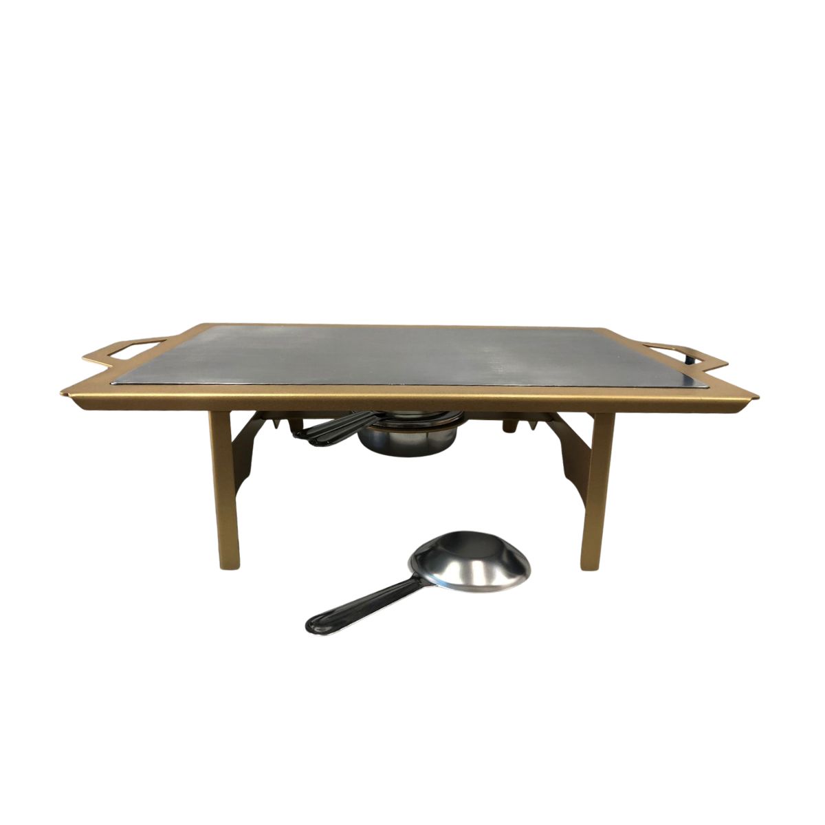 RECHAUD RETANGULAR EM AÇO DOURADO COM CHAPA DIFUSORA DE CALOR EM ALUMINIO 50CM x 28CM QUEIMADOR INOX CAPACIDADE 150 ML